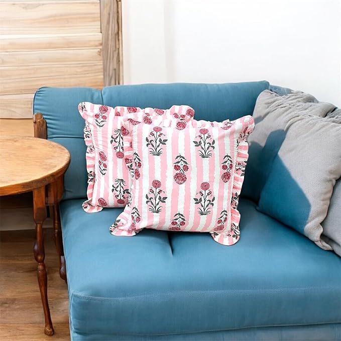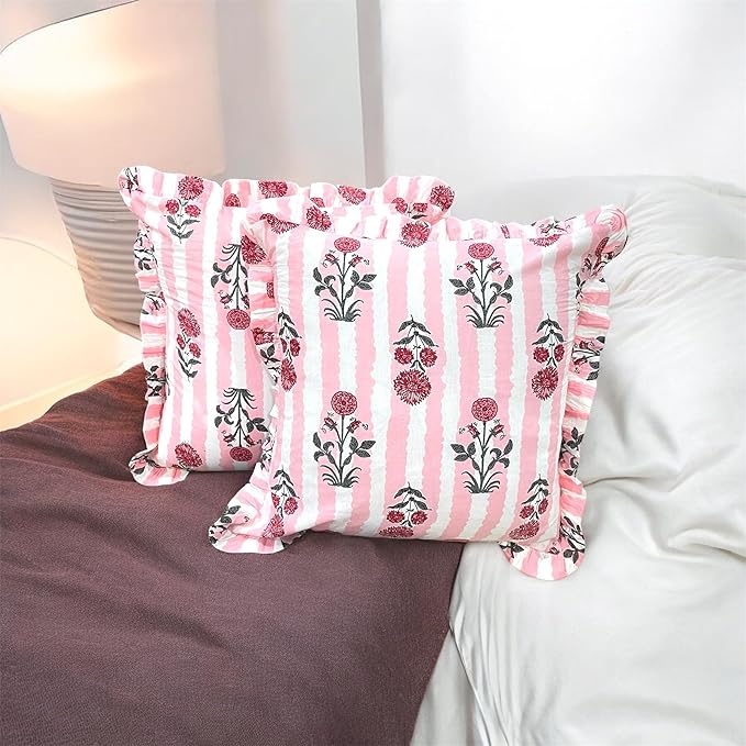 ハンドブロックコットン クッションカバー(フリル付き)|2枚セット|洗濯可能・ソファ&寝室におしゃれ(ピンク 16×16インチ)