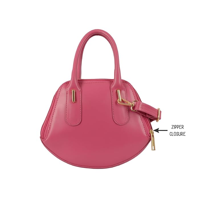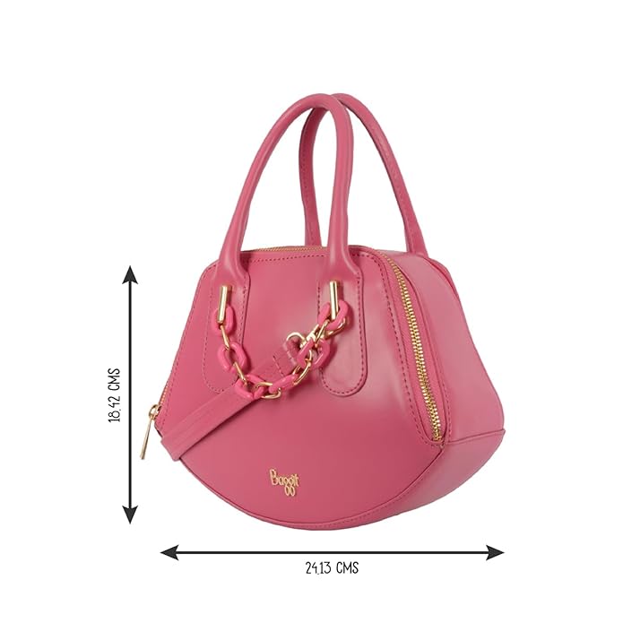 ヨーロッパ風の上品なデザインが魅力のハンドバッグ。個性的な形とゴールド金具で高級感アップ。ピンクの外観に2つのメイン収納とポケット付き。クルエルティフリー素材使用、インド製・6ヶ月保証。ギフトやお出かけに最適です。