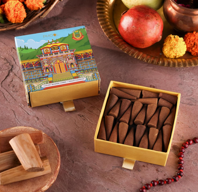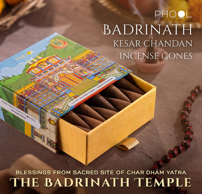 PHOOL ラグジュアリーインセンス バドリナートコーンは、神聖な ケサル・チャンダンの香り が特徴で、敬虔な バドリナート寺院 に捧げられた花から作られています。1パックには 40本の天然香コーン が入っており、プージャや瞑想、自宅での落ち着いた神聖な雰囲気作り に最適です。心を込めて手作りされており、長時間続く神聖な香りであなたの空間をより特別に演出します。