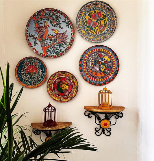 マドゥバニ アイアン ウォール プレート - 5 個セット (マルチカラー) 壁装飾アイテム|リビングルーム、ベッドルーム、オフィス用の壁装飾やギフトアイテムとして最適です