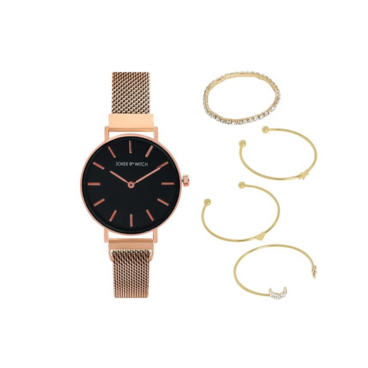 ステンレス製 レディース フェリカ アナログ腕時計&ブレスレットセットコンボ(ブラックダイヤル/ローズゴールドバンド)